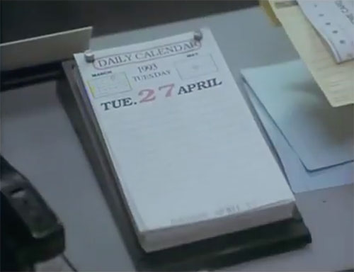 | 12:01 April 26, 1993 Monday. The day before the day that Barry Thomas re-lives over and over and over. Note on his desk calendar, which he flips over each time he re-lives the next day: "Pick up fish food". |