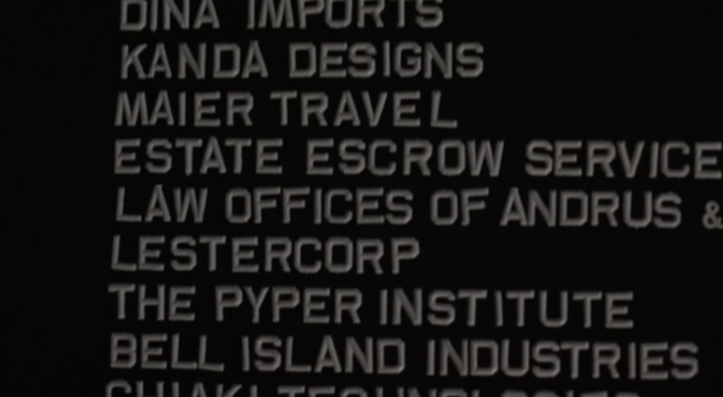 | BEING JOHN MALKOVICH The Pyper Institute Company listed on the business directory in the lobby of the Mertin Flemmer building, home of Lester Corp, where Craig goes to work on the 7 1/2 floor. |