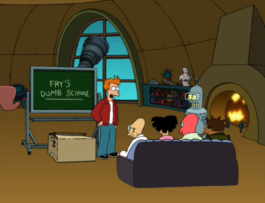 | FUTURAMA Fry's Dumb School When Brain Spawns make everybody on Earth stupid but Fry, Fry starts up his own school, aptly called Fry's Dumb School. |