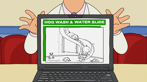 | BOB'S BURGERS Hog Wash & Water Slide Mr. Fischoeder's idea for a new ride at Wonder Wharf - water slide with hogs. |