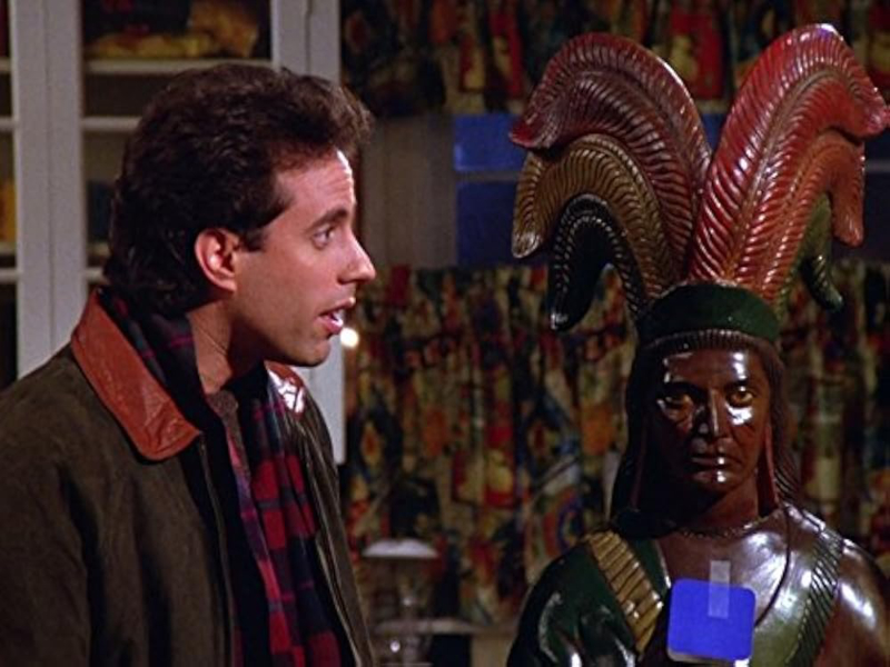 | SEINFELD Revelations Antiques Antique store where Jerry buys the cigar store Indian for Elaine. Sign reads: "Revelations Antiques ...and not so antique 777-3810". |