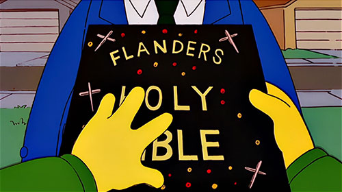 | THE SIMPSONS Holy Bible! Religious book on Ned Flanders' bookshelf. |