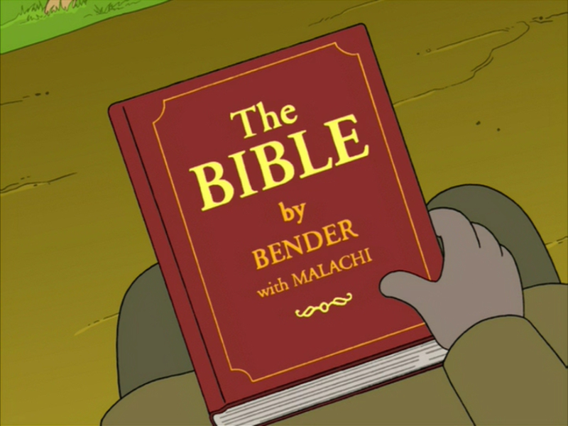 | FUTURAMA The Bible Religious book written by the civilization that grows on Bender while he floats through space. |