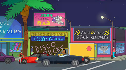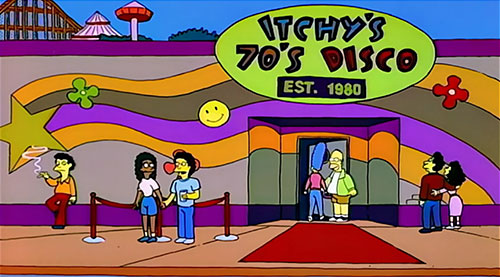 | THE SIMPSONS Itchy's 70s Disco Nightclub on Itchy & Scratchy Land's Parents' Island, where Homer and Marge go. "Est. 1980" |
