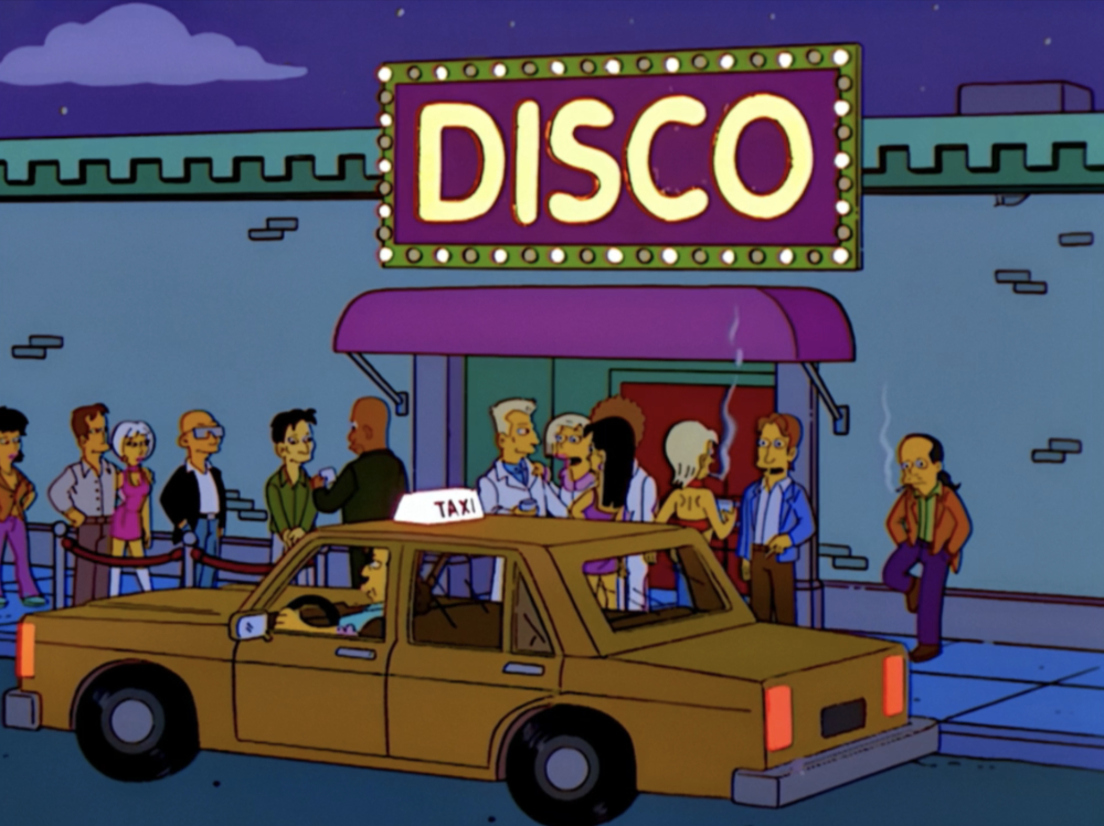 | THE SIMPSONS Disco Generic nightclub. Disco Stu takes a taxicab from the Disco and gets on TV show Taxicab Conversations, where they film secretly passengers and catch them at their most uninhibited. |