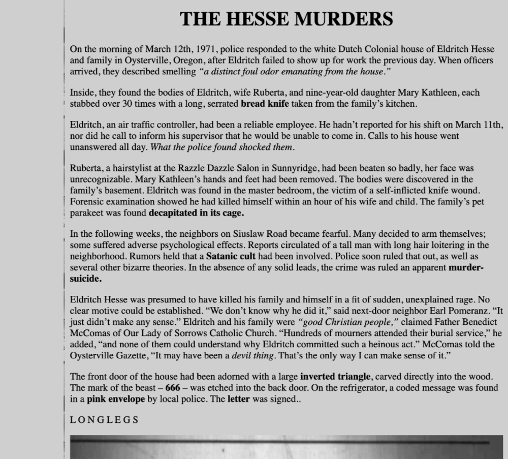 | LONGLEGS Razzle Dazzle Salon Salon where Longlegs victim Eldritch Hesse's wife Ruberta worked in Sunny Ridge, Oregon. |