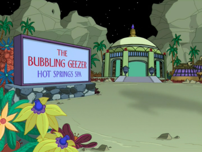 | FUTURAMA The Bubbling Geezer Hot springs spa where the crew takes Professor Farnsworth for youth treatments. |