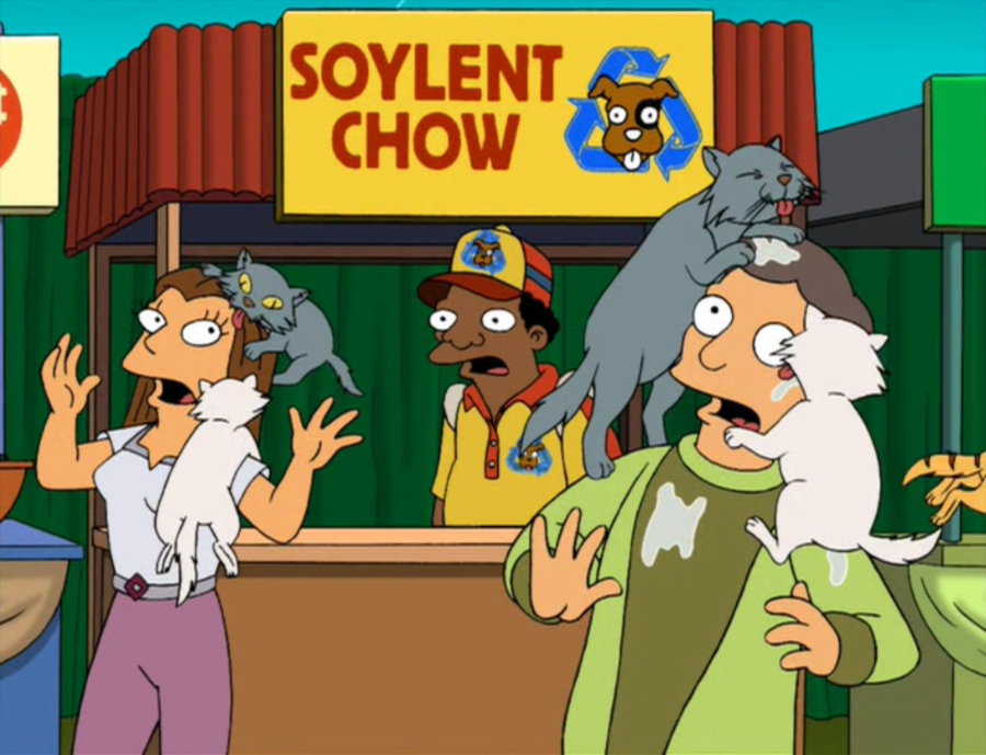 | FUTURAMA Soylent Chow Dog food made from dogs with the slogan "It's a dog-eat-dog world". |