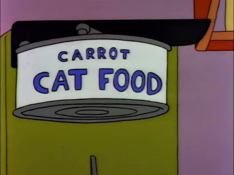 | THE SIMPSONS Carrot Cat Food Snowball II's new cat food when the family cuts back on expenses because Homer lost his job at the Springfield Nuclear Power Plant. Contents: 88% Ash, 12% Carrots. |