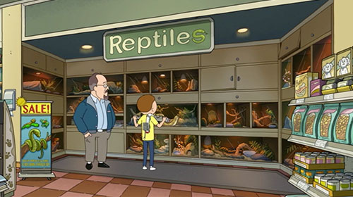 | RICK AND MORTY Repti-Lax Product sold at the pet store where Morty buys space snake astronaut Slippy's doppelganger. |