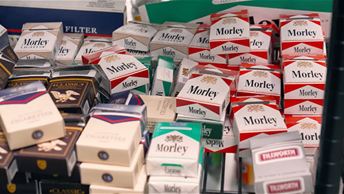 | UP ALL NIGHT Morley Cigarettes Cigarette brand visible behind counter at the convenience store. |