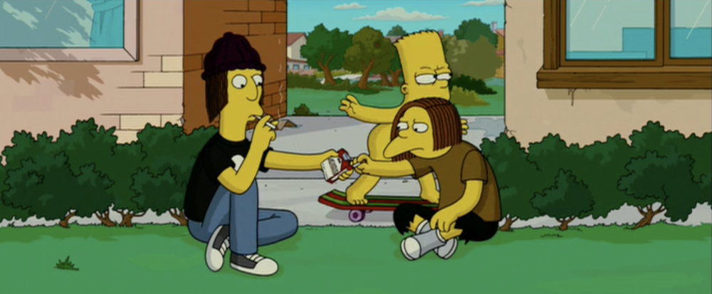 | THE SIMPSONS MOVIE Laramie Cigarettes The Springfield Elementary bullies are smoking cigarettes when Bart skateboards by naked. |