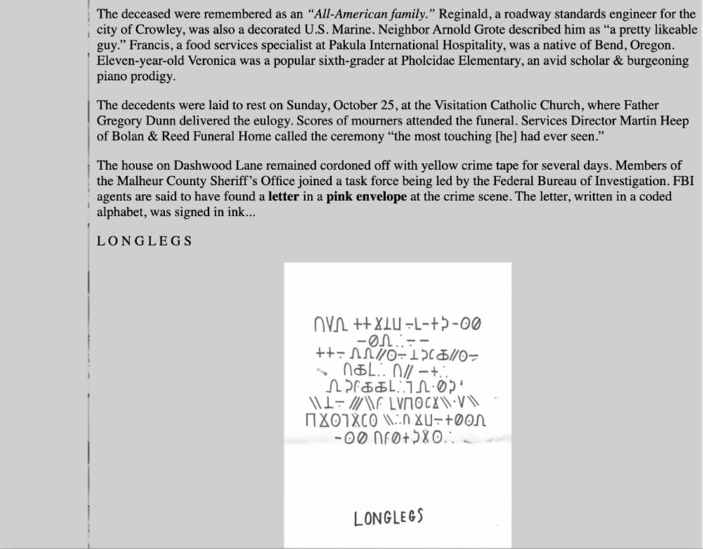 | LONGLEGS Dashwood Lane Address of Longlegs victims the Bannister family's residence. |