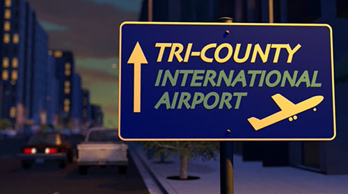 | THE SIMPSONS Shelbyville Airport Homer rents a private plane flying out of Shelbyville Airport to make his confession to Marge that he didn't get the new job. |