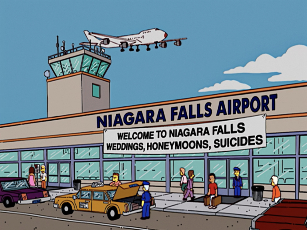 | THE SIMPSONS Niagara Falls Airport Homer and Marge fly in to Niagara Falls after Bart and Lisa track them down in Atlantic City. "Welcome to Niagara Falls Weddings Honeymoons Suicides" |