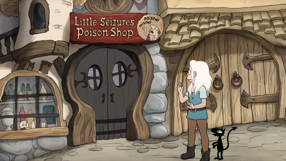 | DISENCHANTMENT Little Seizures Poison Shop Store in Dreamland. Reference to Little Caesar's Pizza. "Poison! Poison!" |