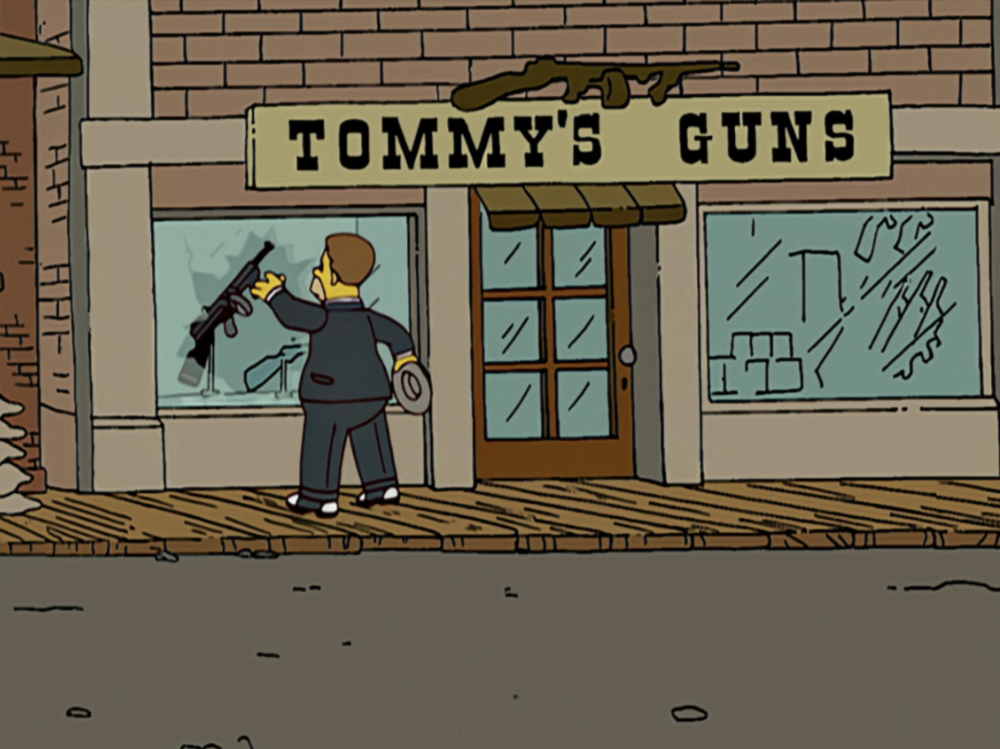 | THE SIMPSONS Tommy's Guns Gun store where Clyde gets a gun to rob his father's feed store next door. |