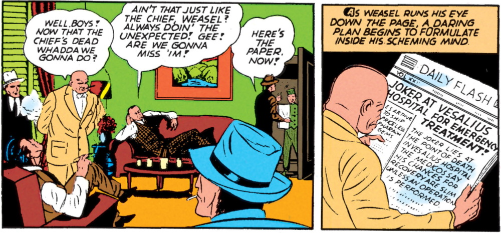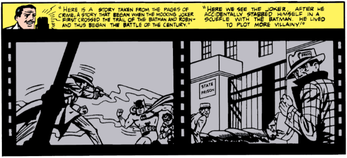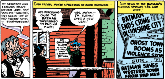Newspaper headline: Batman Saves Western Town From Bad Men.