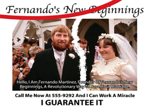 | # | | 1 | Fernando's New Beginnings  | GRAND THEFT AUTO III 2001 Video Games | Services | Services-misc | | Fernando's New Beginnings Program created by Fernando Martinez advertised on the radio, designed to "bring the passion back to your marriage" by having husbands sleep with other women, because they no longer wish to sleep with their wives.