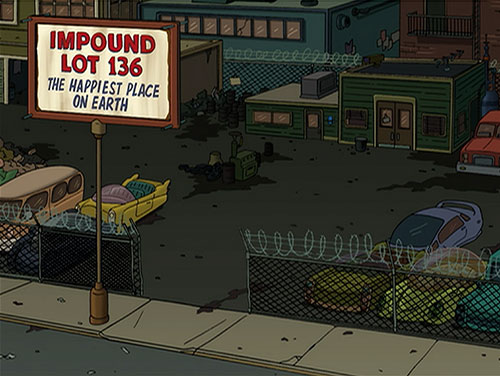 | # | | 1 | Impound Lot 136  | FUTURAMA 1999 Animated Series | Vehicles | Automotive Services | | Impound Lot 136 Lot where Bender wakes up, unable to remember the night before.