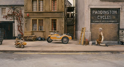 Store where Mr. Fox and Kylie steal a motorcycle with sidecar. "A division of Paddington Automotive"