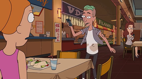 | # | | 1 | Flams  | RICK AND MORTY 2013 Animated Series | Dining | Fast Food | | Flams Fast food restaurant in the Merpal's Mall food court where Beth and Summer eat lunch.