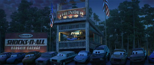 | # | | 1 | Foster's Shocks-n-All Bargain Garage  | CARS 3 2017 Animated Film | Vehicles | Automotive Services | | Foster's Shocks-n-All Bargain Garage Automotive product advertisement visible at the Thunder Hollow racetrack.