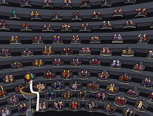 | # | | 1 | Star System Acroilius  | THE SIMPSONS 1989 Animated Series | Outer Space | Star Systems | | Star System Acroilius Instead of action, Star Wars: The Phantom Menace parody movie Cosmic Wars: The Gathering Shadow features two hours of political intrigue, with the Empire's Galactic Senate calling roll for numerous star systems. One star system representative that resembles an AT-AT from Star Wars proposes an amendment to Space bill number 371. When told to wait it's turn, it sits down and reads an Evening Standard newspaper.