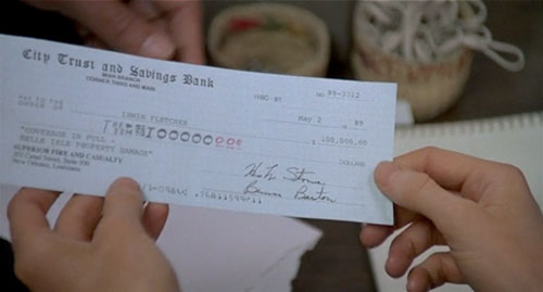 Following the destruction of his aunt Belle Fletcher's estate, Fletch receives a check from Superior Fire and Casualty for $100,000, issued by City Trust and Savings Bank.