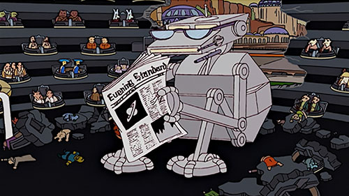 | THE SIMPSONS Evening Standard Instead of action, Star Wars: The Phantom Menace parody movie Cosmic Wars: The Gathering Shadow features two hours of political intrigue, with the Empire's Galactic Senate calling roll for numerous star systems. One star system representative that resembles an AT-AT from Star Wars proposes an amendment to Space bill number 371. When told to wait it's turn, it sits down and reads an Evening Standard newspaper. |