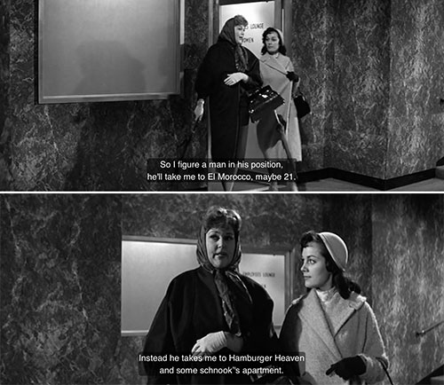 Restaurant that a female Consolidated Life employee mentions: So I figure a man in his position, he'll take me to El Morocco, maybe 21. Instead he take me to Hamburger Heaven, and some schnook's apartment.