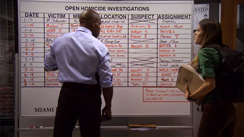 | DEXTER January 12, 2011 Date of an open homicide on Miami Metro's Open Homicide Investigations white board. |