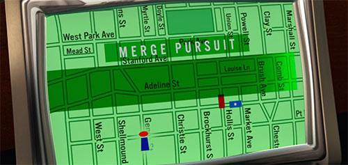 Street on the GPS map in Mr. Incredible's car during opening chase sequence.