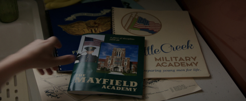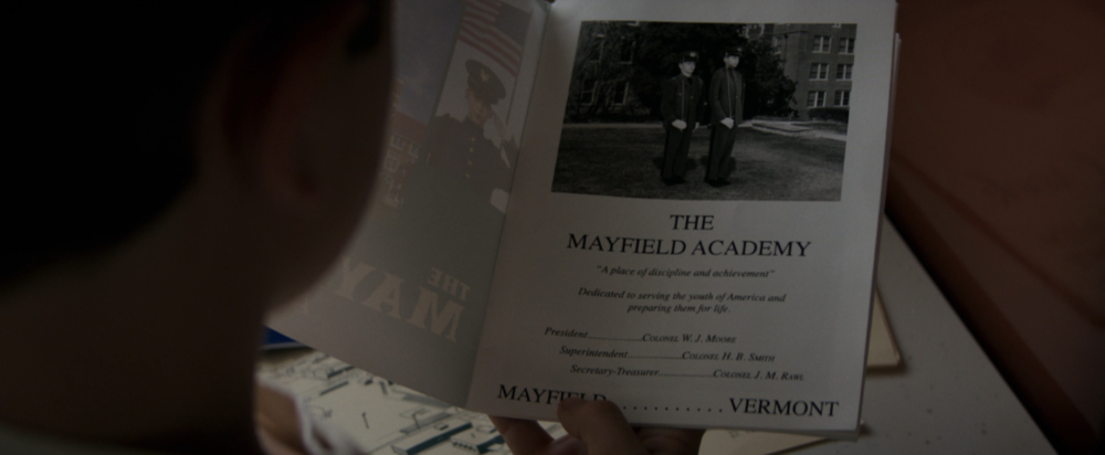 Vermont town. Home of The Mayfield Academy, a boarding school that Gardner considers for his son Nicky after his wife is killed.