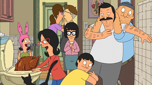 | BOB'S BURGERS November 28, 2013 Bob finds his third and fourth Thanksgiving turkeys in the toilet. He buys one last turkey, but after falling asleep at the table during Thanksgiving dinner, he sleepwalk carries it tot he bathrooms and puts it in the toilet, dreaming that he's potty training Tina. |