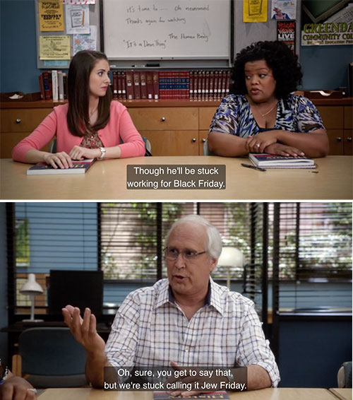 | COMMUNITY November 29, 2013 Black Friday. Shirley mentions that while she's having Andre's family over for Thanksgiving, he'll be stuck working. |