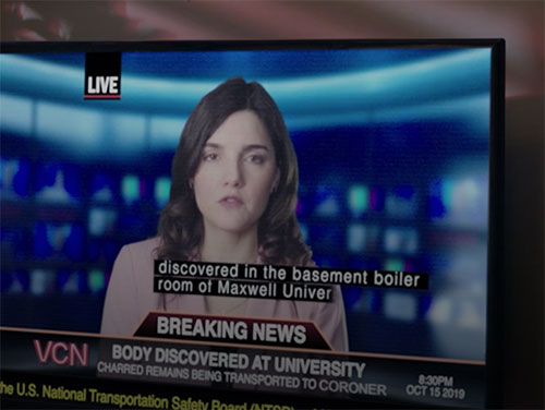 After Danny's body is found, VCN TV news features Breaking News report: BODY DISCOVERED AT UNIVERSITY / CHARRED REMAINS BEING TRANSPORTED TO CORONER.