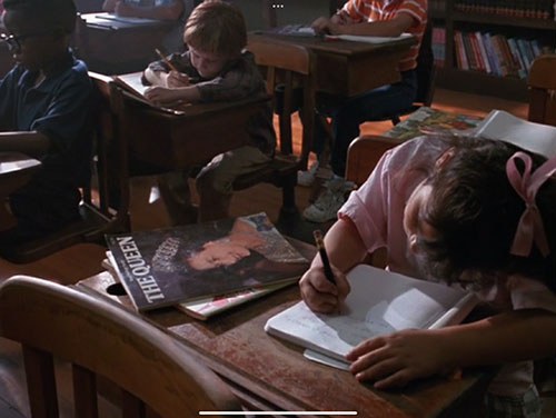 Magazine on the desk of the little girl writing a letter to the queen of England.