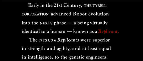 Early in the 21st Century, The Tyrell Corporation advanced Robot evolution into the NEXUS phase - a being virtually identical to a human - known as a replicant.