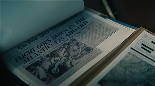 | The New York Examiner Newspaper headline about the crash of Trans-Oceanic Flight 37 that Marie and Jordan find in Dean Shetty's office: Flight Goes Down in the Atlantic - 123 Aboard.