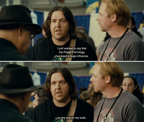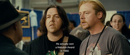 Film 2011. Written by Simon Pegg and Nick Frost. Directed by Greg Mottola. Starring Simon Pegg, Nick Frost, Kristen Wiig, Bill Hader, Blythe Danner, Jane Lynch, David Koechner, Sigourney Weaver, Jeffrey Tambor and Seth Rogen.