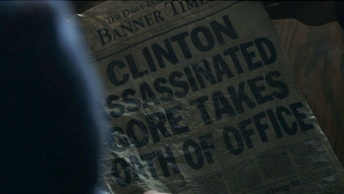 | Banner Times The newspaper wrapped around the strange device in Ronan's father's satchel. The headline is about President Clinton being assassinated.