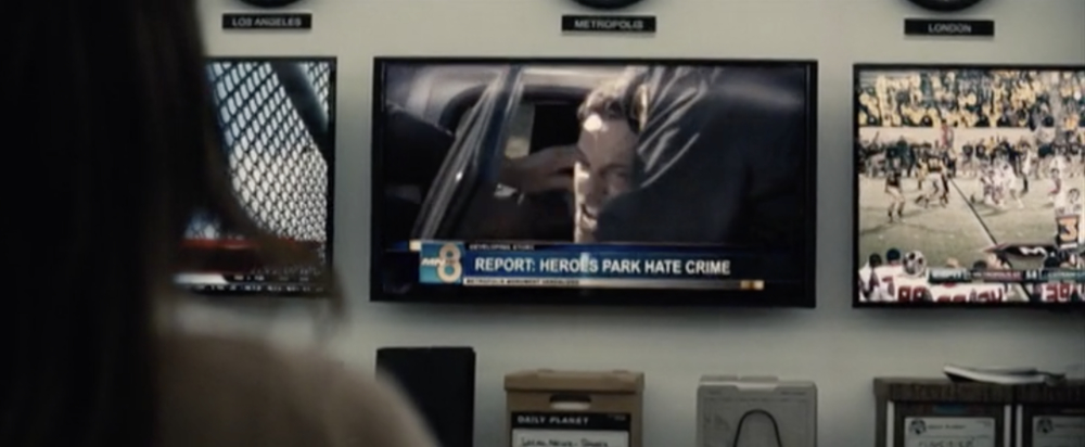 Date of armed robbery marked on Bruce's map of Superman's activities.