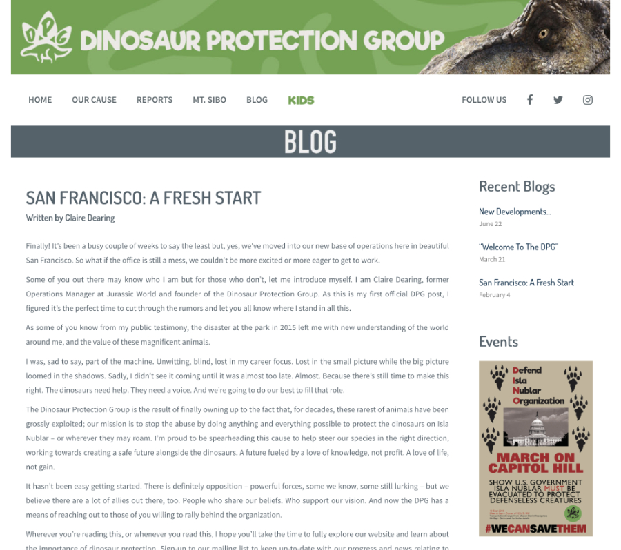 | | 12 | February 4, 2018  | Dates | 21st Century: 10s | Events | | February 4, 2018 Date of Blog post "San Francisco: A Fresh Start" on the promotional Dinosaur Protection Group website.