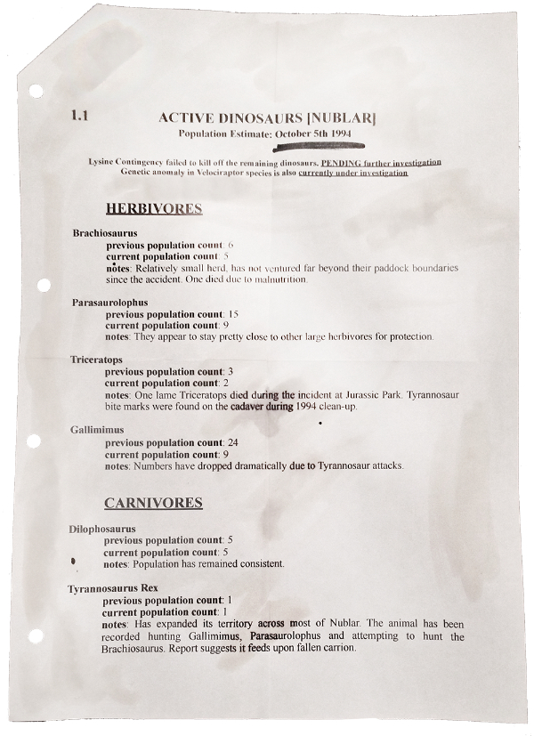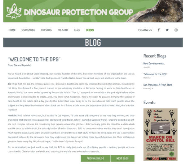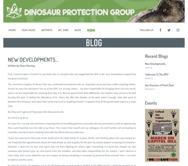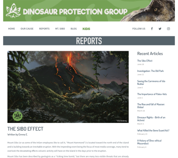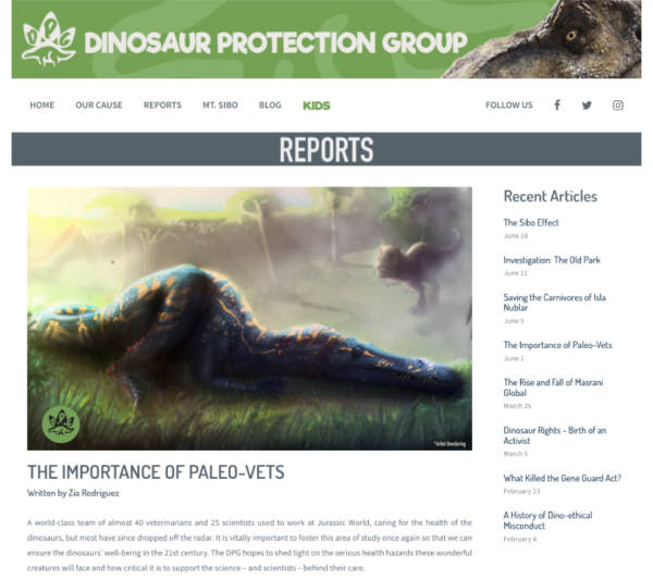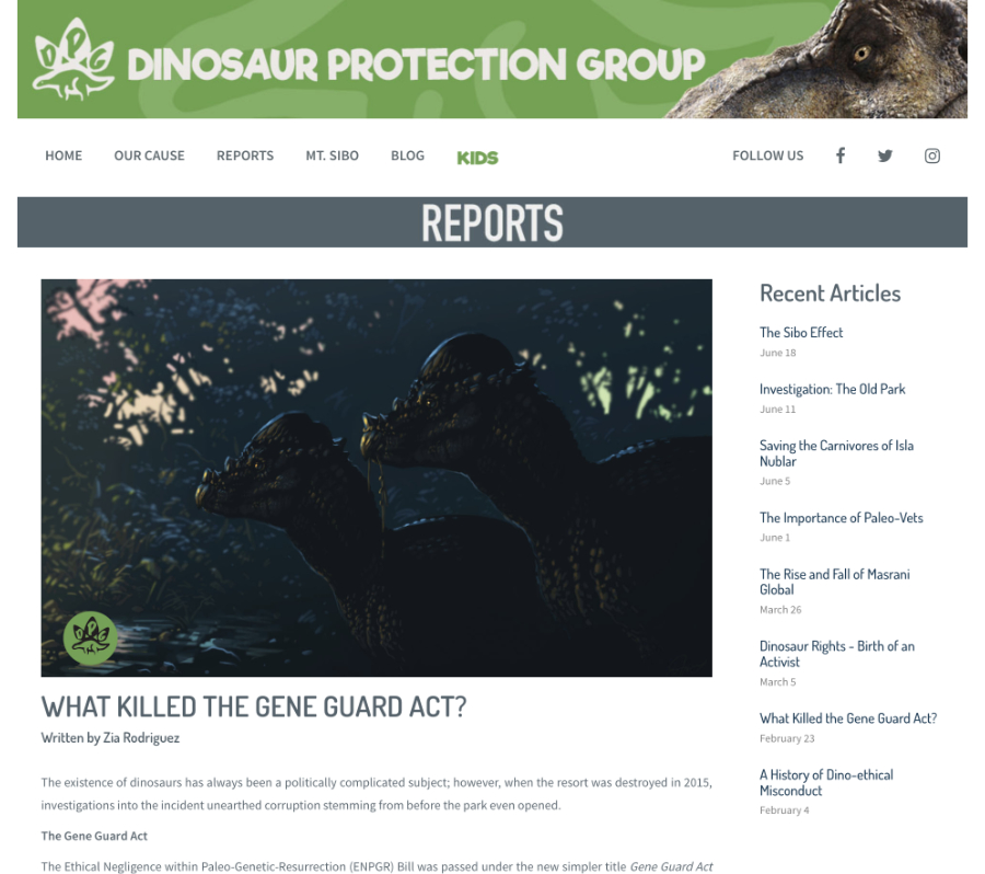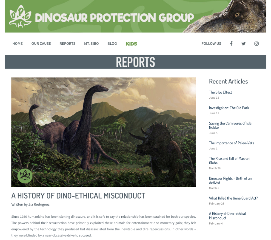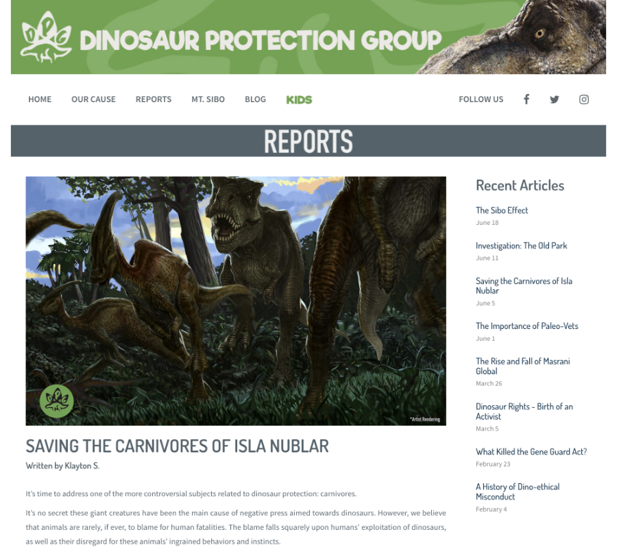 | | 18 | June 5, 2018  | Dates | 21st Century: 10s | Events | | June 5, 2018 Date of posted Report "Saving the Carnivores of Isla Nublar" on the promotional Dinosaur Protection Group website.