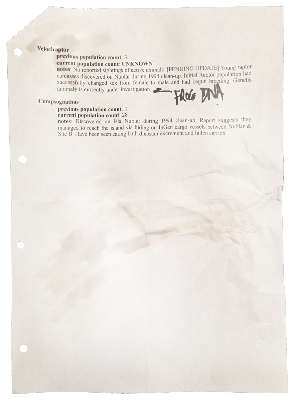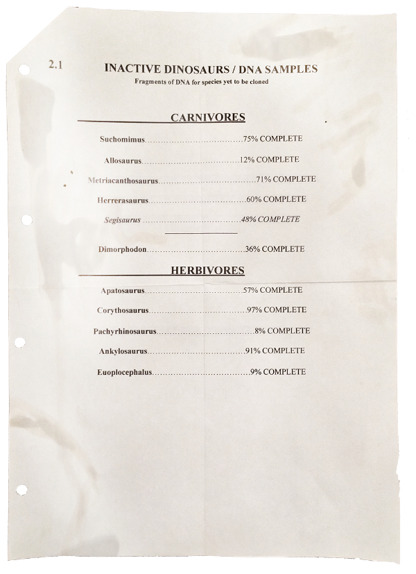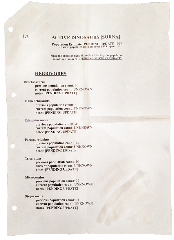| | 23 | Isla Sorna  | Map | Geographic Areas | Islands | | Isla Sorna Island, also known as Site B, location of the original Jurassic Park research station. Mentioned on the promotional Dinosaur Protection Group website: Interest in the animals skyrocketed, spiking when International Genetic Technologies InGen Founder John Hammond spoke during a television interview about working with the Costa Rican Department of Biological Preserves to establish a set of laws for the "preservation and isolation" of the animals on Islas Sorna and Nublar. This task-force joining the private and public sector brought about the now extinct Gene Guard Act.