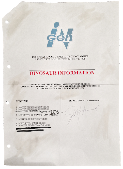 | | 4 | InGen  | BBB | Companies | Companies-misc | | InGen John Hammond's company, International Genetic Technologies, discussed in detail the promotional Dinosaur Protection Group website. The site also features the company's asset catalog.