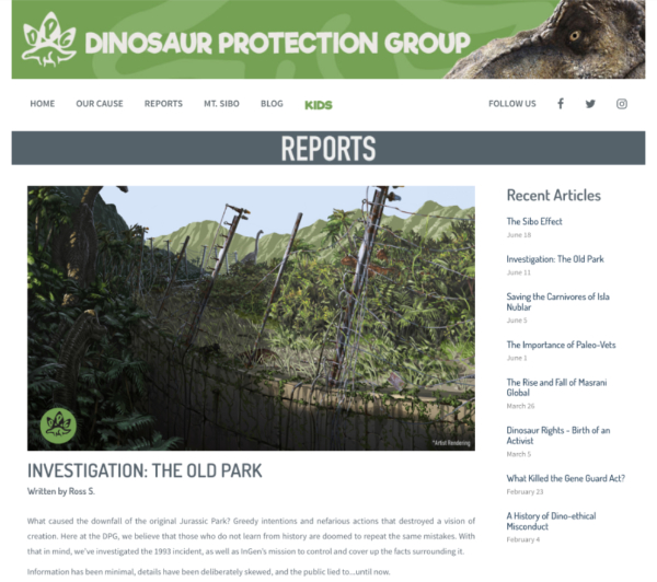 | | 19 | June 11, 2018  | Dates | 21st Century: 10s | Events | | June 11, 2018 Date of posted Report "Investigation: The Old Park" on the promotional Dinosaur Protection Group website.