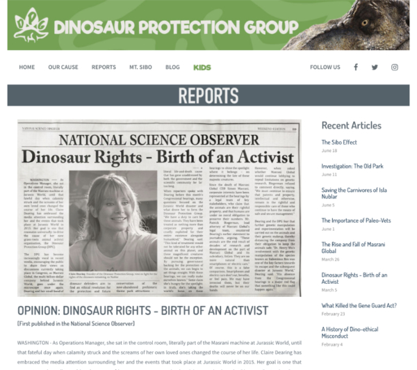 | | 9 | National Science Observer  | BBB | Media | Newspapers-misc | | National Science Observer Newspaper featured on the promotional Dinosaur Protection Group website. headline: Dinosaur Rights - Birth of an Activist.