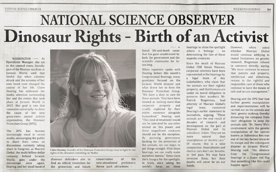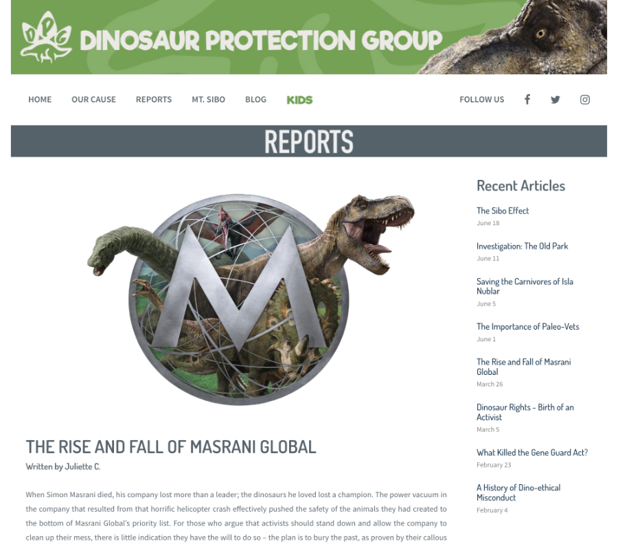 | | 16 | March 26, 2018  | Dates | 21st Century: 10s | Events | | March 26, 2018 Date of posted Report "The Rise and Fall of Masrani Global" on the promotional Dinosaur Protection Group website.